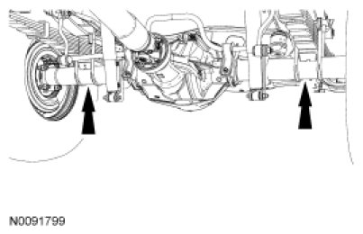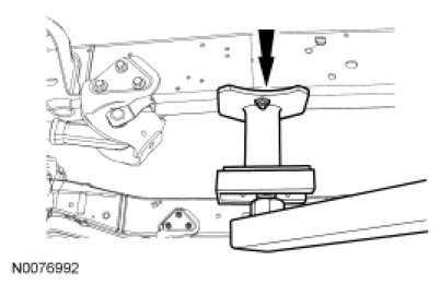 NOTICE: Damage to suspension, exhaust and steering linkage components can occur if care is not exercised when positioning the hoist adapters prior to lifting the vehicle.