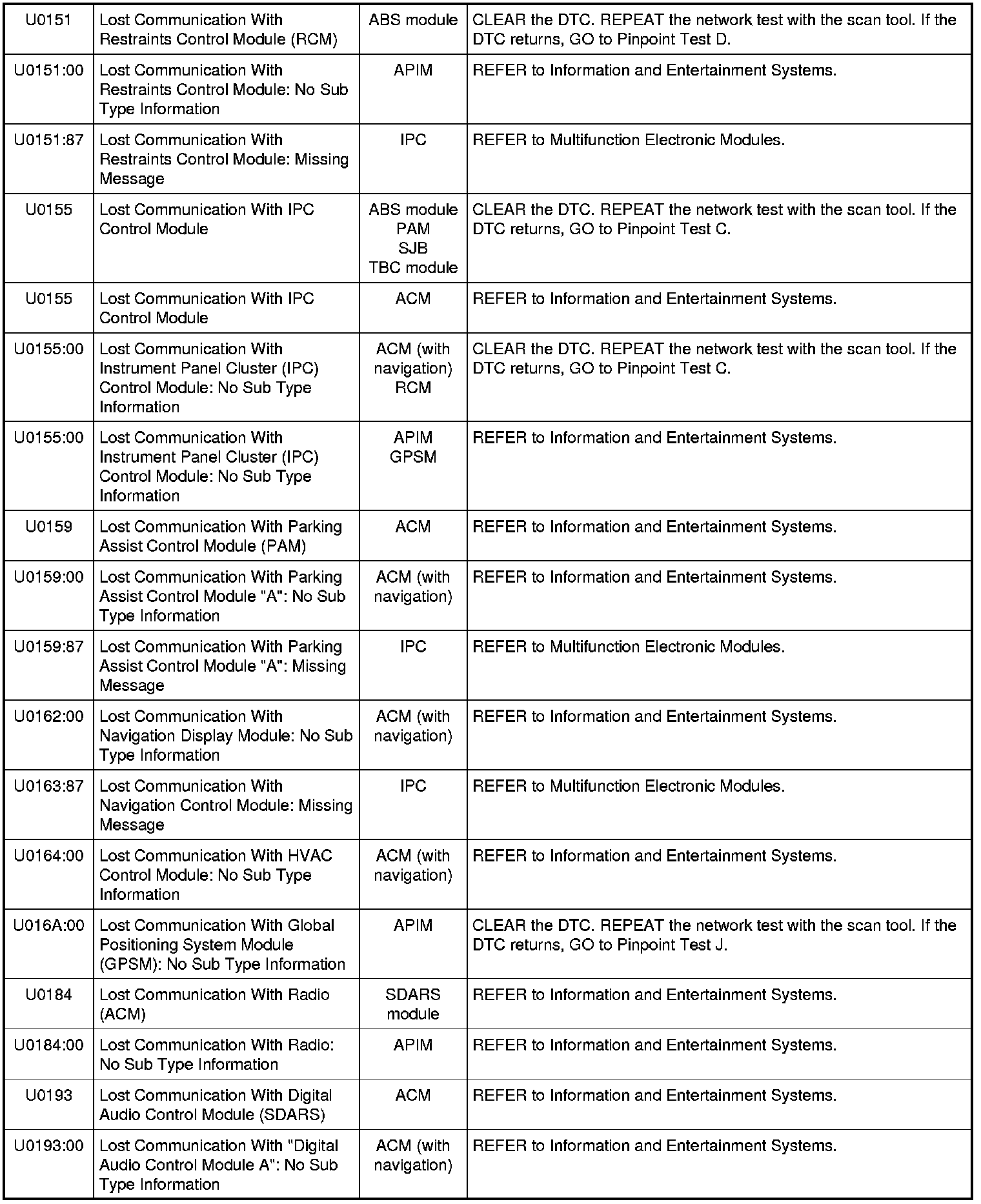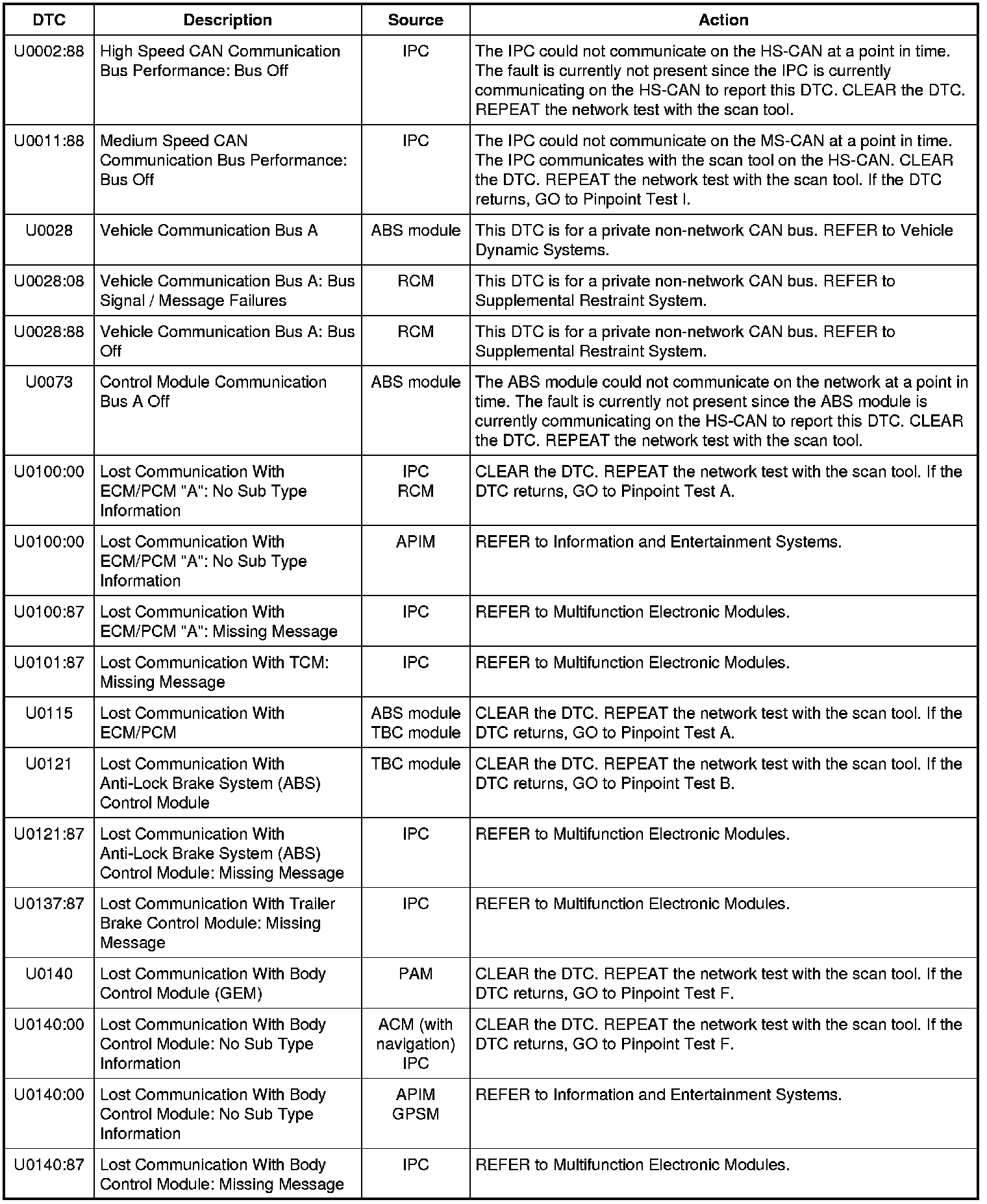 NOTE: Network DTCs (U-codes) are often a result of intermittent concerns such as faulty wiring or low battery voltage occurrences. Additionally, vehicle service procedures such as module reprogramming will often set network DTCs. Replacing a module to resolve a network DTC is unlikely to resolve the concern. To prevent repeat network DTC concerns, inspect all network wiring, especially connectors. Test the vehicle battery, refer to Battery, Mounting and Cables Testing and Inspection.