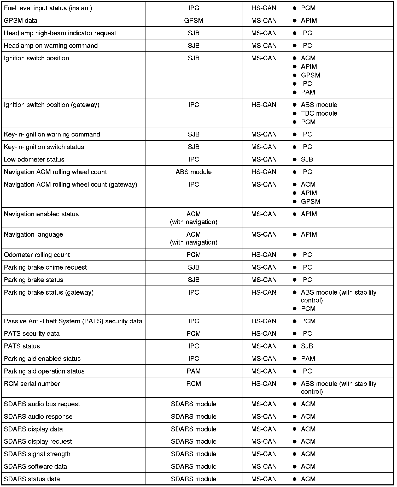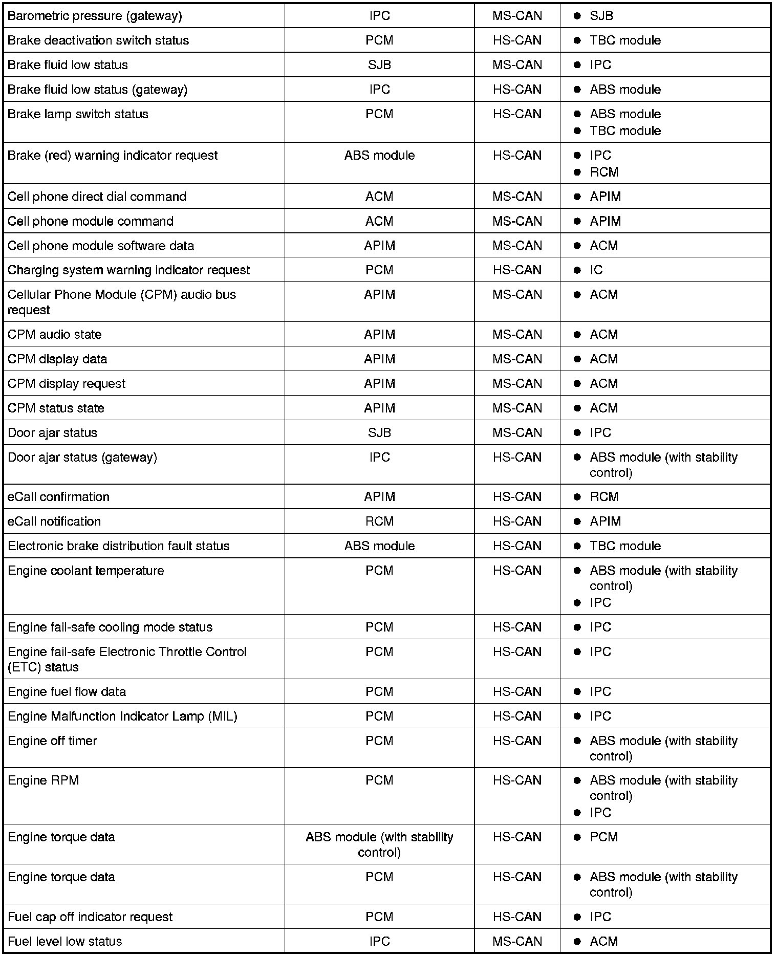 Modules on the CAN utilize simultaneous communication of two or more messages on the same network circuits. The following chart summarizes the messages sent and received on the network.