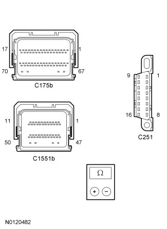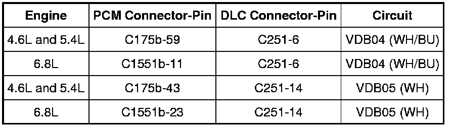 - Measure the resistance between the Data Link Connector (DLC) C251-6, circuit VDB04 (WH/BU), harness side and the DLC C251-14, circuit VDB05 (WH), harness side.