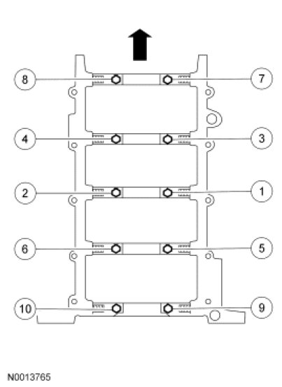 Install the 10 side bolts and tighten them in 2 stages, in the sequence shown.