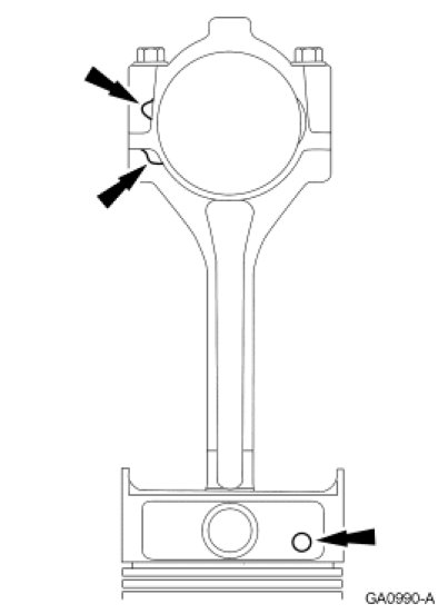 1. NOTE: Connecting rod must be installed into piston with identification markings toward front.