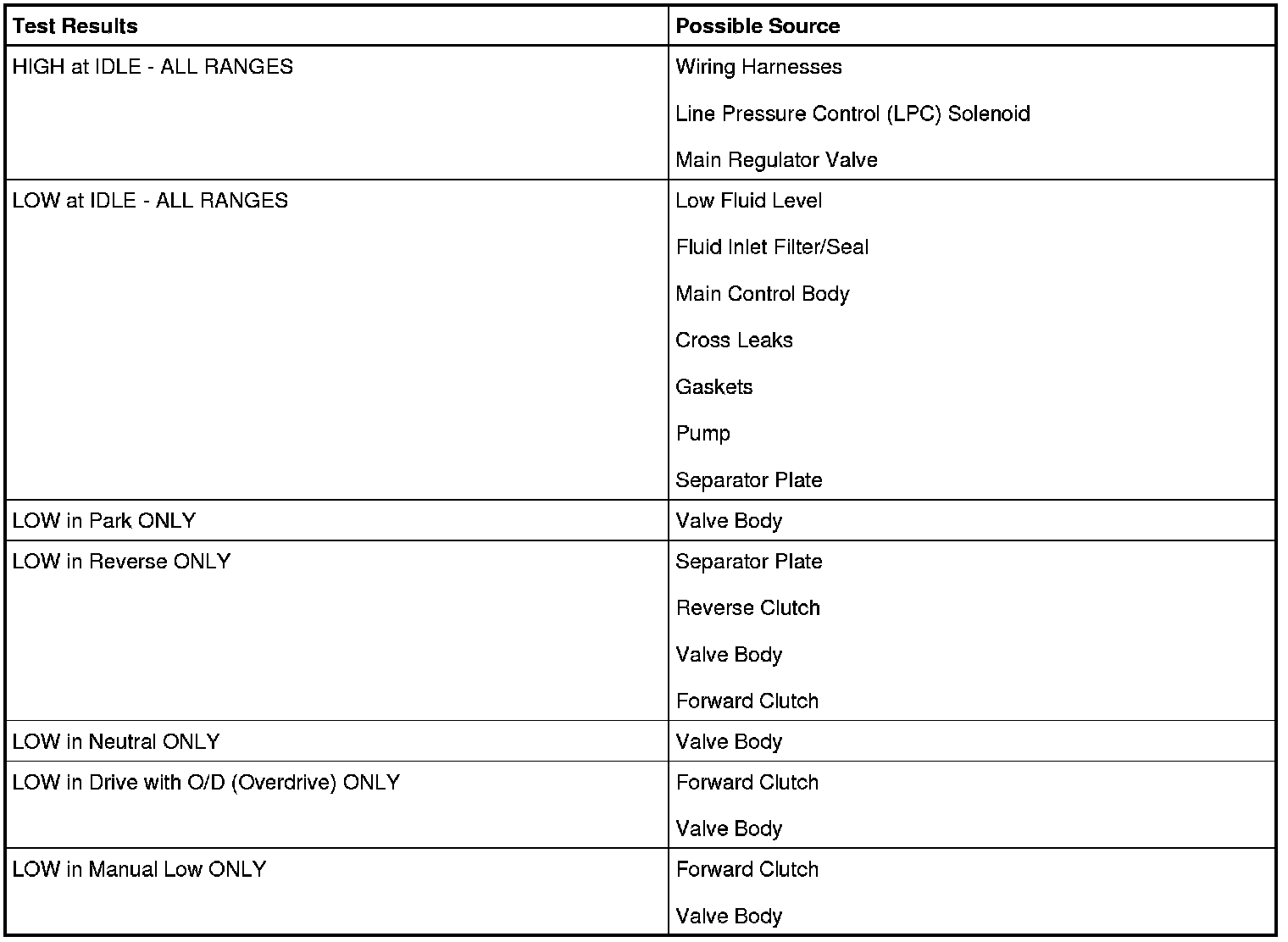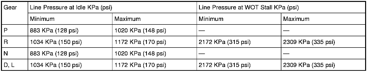 3. If the line pressure is not within specification, see the Line Pressure Diagnosis Chart for line pressure concerns.