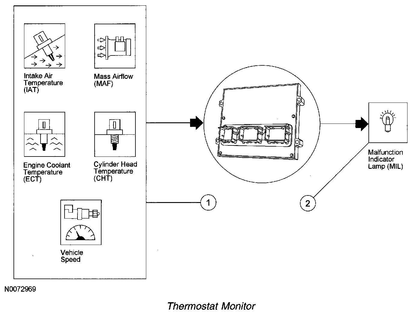 The thermostat monitor is designed to verify correct thermostat operation. This monitor is executed once per drive cycle and has a monitor run duration of 300-800 seconds. If a concern is present, diagnostic trouble code (DTC) P0125 or P0128 is set and the malfunction indicator lamp (MIL) is illuminated.