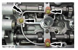 13. Install the LH valve train oil tube and the 3 bolts and tighten in 2 stages.
