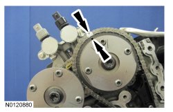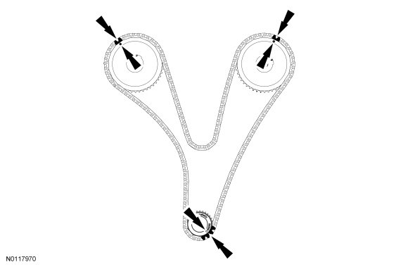 7. Mark the timing chain link that aligns with the timing mark on the LH intake VCT (Variable Camshaft Timing) assembly as shown.