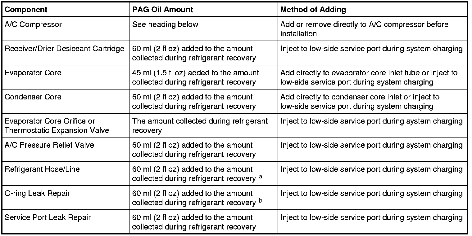 a If an excessive amount of refrigerant oil is lost due to a hose rupture/separation or other damage, the total system refrigerant oil capacity must be added.