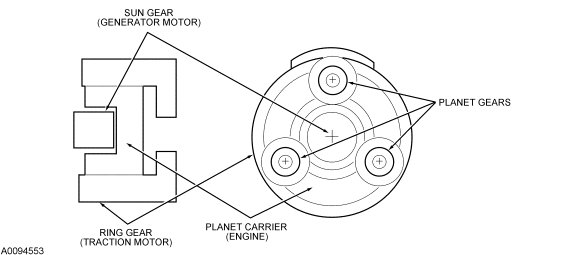 The planetary gear set, the generator motor, and the traction motor are internal to the electronically controlled CVT. The planetary gear set mechanically links the internal combustion engine, the electric traction motor, and the electric generator together. It distributes power between the three elements that it connects. The engine is connected to the carrier, the generator motor is connected to the sun gear, and the traction motor is connected to the ring gear of the planetary gear set.
