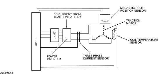 The traction motor is a three-phase permanent magnet AC motor connected to the ring gear of the planetary gear set. The traction motor is connected to the drive wheels through a series of gears and rotates whenever the drive wheels rotate. The traction motor power inverter (internal to the transaxle) receives a DC current from the high voltage traction battery. The DC current is inverted to an AC current, which is controlled by the TCM and the motor control unit (MCU). The traction motor can deliver positive torque by propelling the vehicle in the forward or reverse direction. It can also provide negative torque by functioning as a generator during the regenerative braking. The TCM receives input from the position sensor as well as the motor coil temperature sensor. The TCM monitors the motor coil temperature and sets a DTC if the temperature exceeds a maximum threshold value. The TCM also monitors motor position, speed, phase current, power inverter temperature, and voltage. The TCM processes a variety of the inputs from the PCM and the traction battery control module (TBCM) to determine motor function. The inputs are divided into two categories: the hardwired signals and the network messages. The inputs used to determine motor function include the total torque desired, the motor inverter shutdown, and the vehicle mode. The traction motor is used to provide torque to the axle shafts and recharge the high voltage traction battery during the regenerative braking. The TCM reports the motor error status to the PCM. The PCM initiates an appropriate LOS mode and sets the DTC P1A0E (Hybrid powertrain control module - traction motor disabled) based on the error status received. The TCM also sets a DTC which indicates the cause of the traction motor concern.