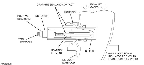 The HO2S detects the presence of oxygen in the exhaust and produces a variable voltage according to the amount of oxygen detected. A high concentration of oxygen (lean air/fuel ratio) in the exhaust produces a voltage signal less than 0.4 volt. A low concentration of oxygen (rich air/fuel ratio) produces a voltage signal greater than 0.6 volt. The HO2S provides feedback to the PCM indicating air/fuel ratio in order to achieve a near stoichiometric air/fuel ratio of 14.7:1 during closed loop engine operation. The HO2S generates a voltage between 0.0 and 1.1 volts.