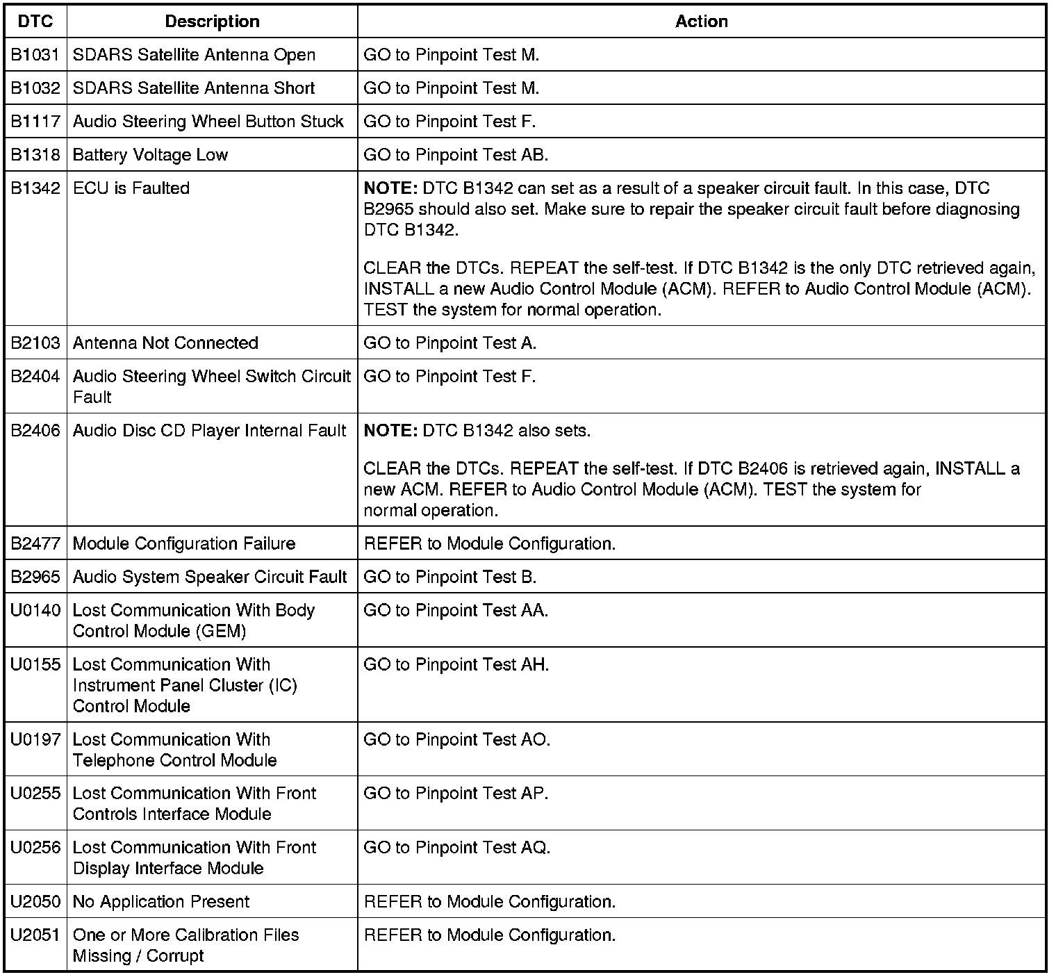Audio Control Module (ACM) - Without Navigation DTC Chart