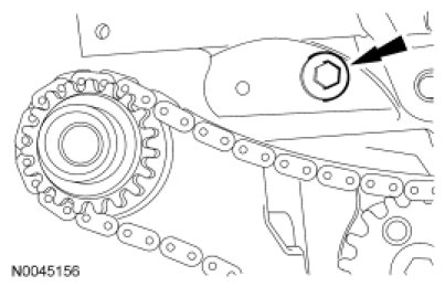 46. Install the Variable Camshaft Timing (VCT) system oil filter and the plug in the intake camshaft thrust cap.
