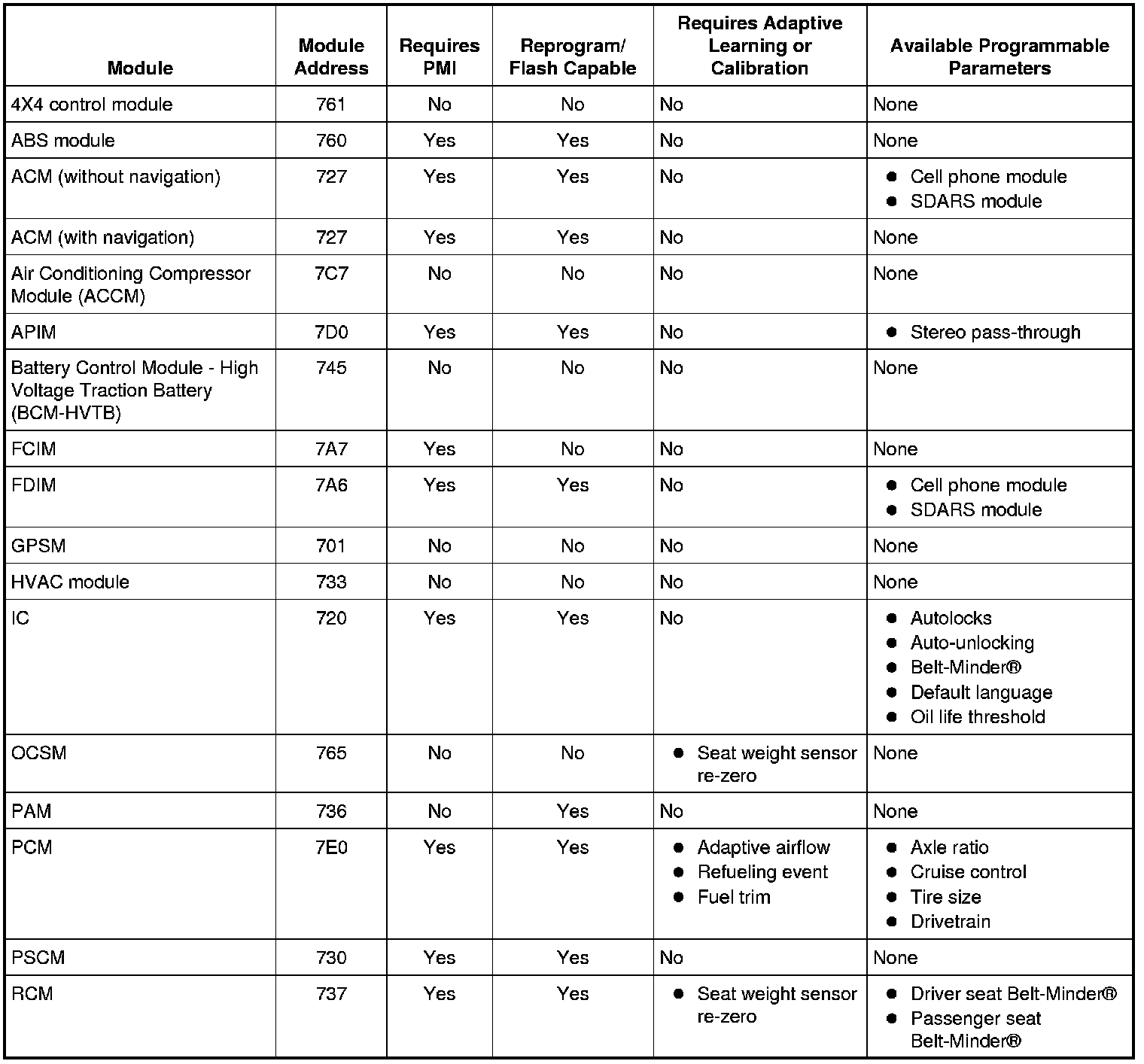 PMI is a scan tool process which configures settings in a new module. Data used for the PMI process is automatically downloaded from the original module and stored when a scan tool session is started. If this data cannot be retrieved from the module being replaced, the scan tool may prompt for As-Built data entry or display a list of parameter values that need to be manually selected. Some modules are reprogrammed during PMI when a strategy/calibration update is available. To carry out PMI, refer to Programmable Module Installation (PMI) Programmable Module Installation (PMI).