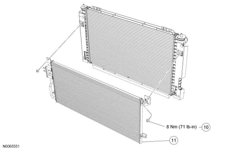 6. Remove the 2 A/C condenser-to-radiator bolts and position aside the A/C condenser from the radiator.