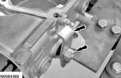 28. Remove the 2 bolts and the transmission fluid reservoir hold-down bracket.