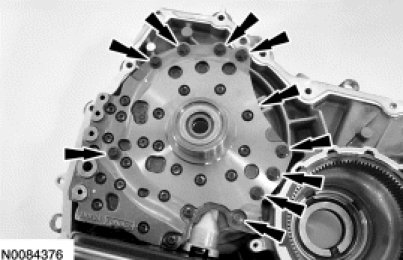 63. Remove the 2 bolts and the oil baffle from the torque converter housing.