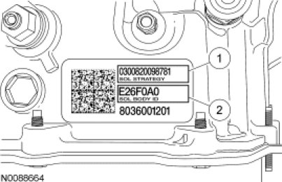 Any time a new solenoid body is installed, a new solenoid body strategy file is downloaded into the PCM using the scan tool. A replacement solenoid body tag is supplied with the new solenoid body which contains the 13-digit solenoid body strategy and the 7-digit solenoid body identification. The new tag is placed over the original solenoid body tag.