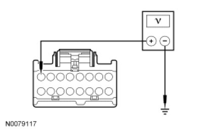 - Measure the voltage between DCSM C3265C-8, circuit CHS14 (GN), harness side and ground.