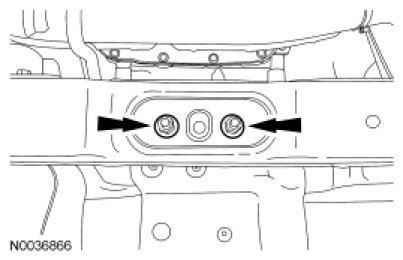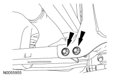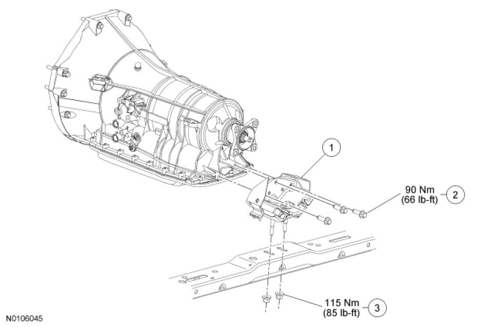 - Tighten the transmission crossmember bolts and nuts to 90 Nm (66 lb-ft).