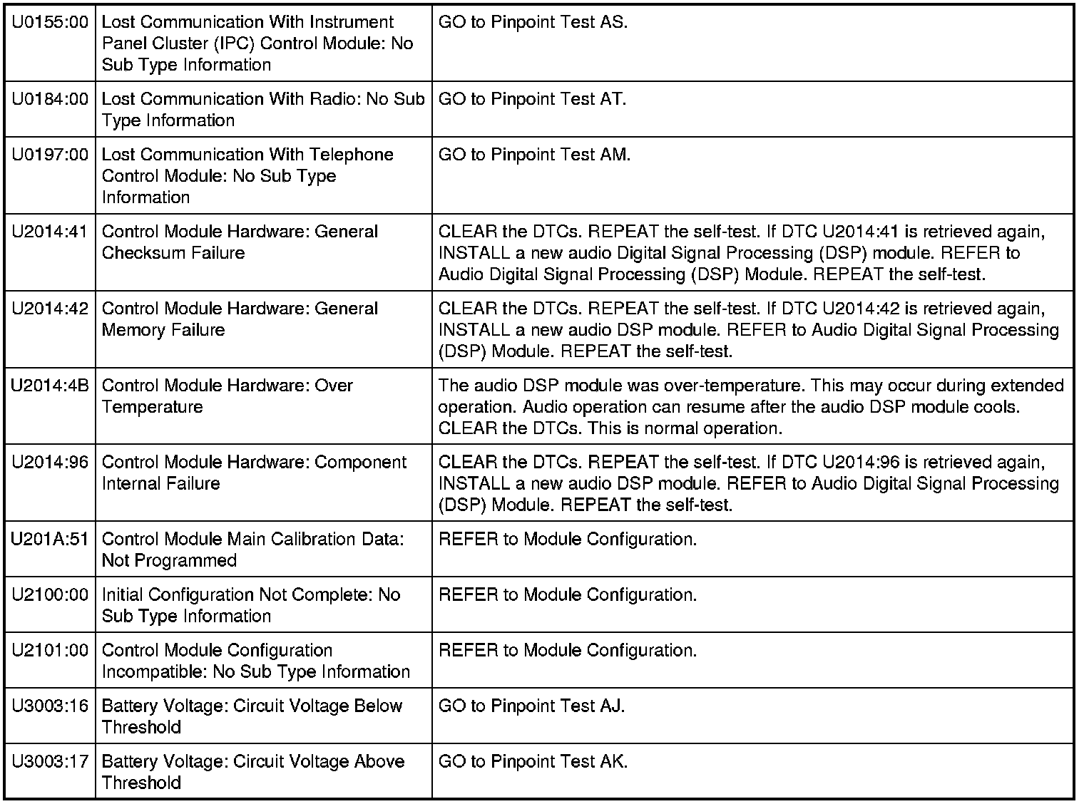 NOTE: This module utilizes a 5-character DTC followed by a 2-character failure-type code. The failure-type code provides information about specific fault conditions such as opens or shorts to ground. Continuous memory DTCs have an additional 2-character DTC status code suffix to assist in determining DTC history.