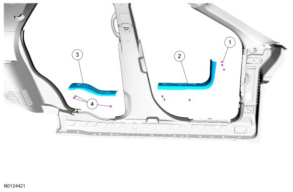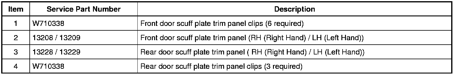 1. Pull upward on the scuff plate trim panel to release the retainer clips and remove the scuff plate trim panel.