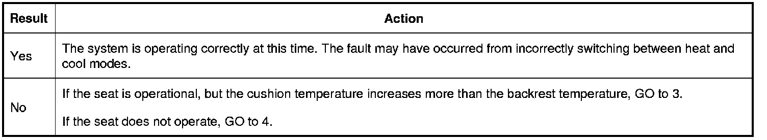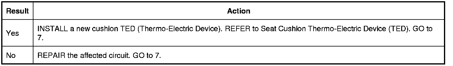 3. Operate the driver seat in high heat or high cool and monitor the seat operation. If a circuit fault is present, the DCSM (Dual Climate Controlled Seat Module) disables the seat.