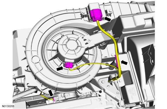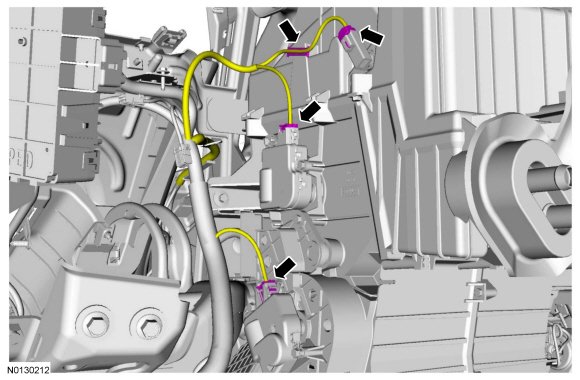 2. Attach the instrument panel wire harness to the heater core and evaporator, attach the wire harness pin-type retainers and connect the 3 electrical connectors.