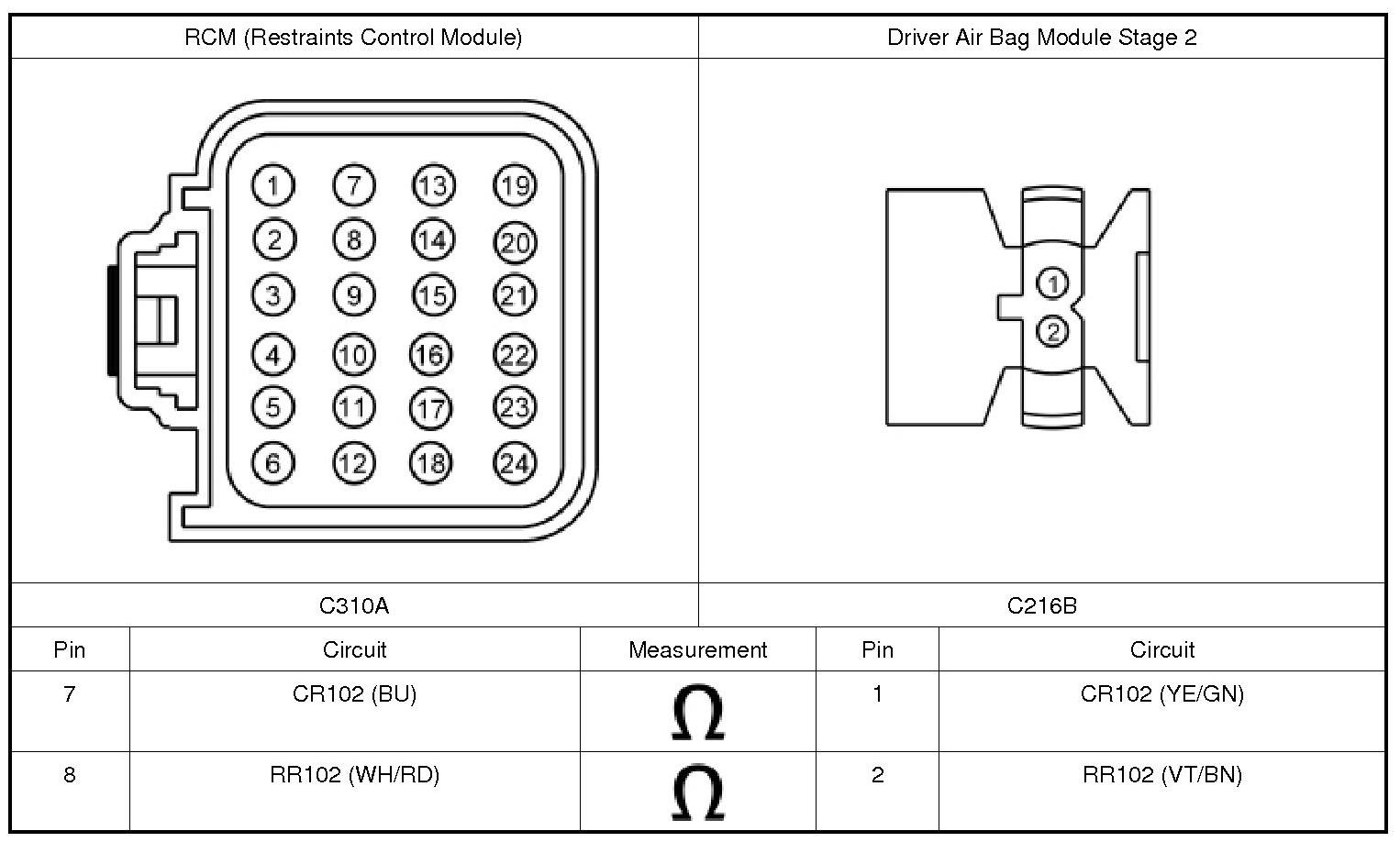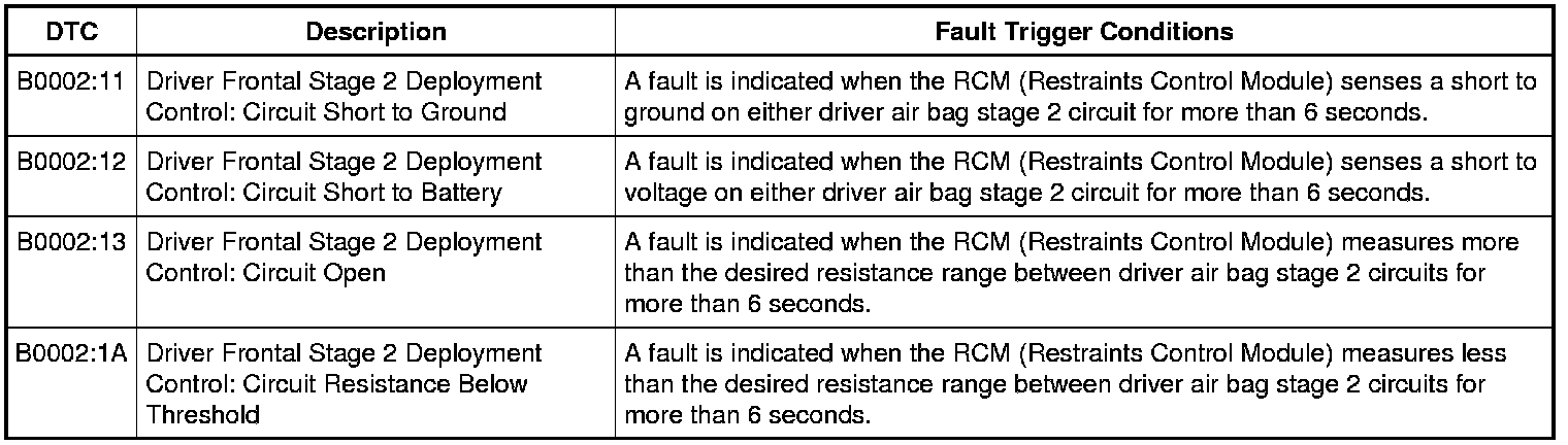 The RCM (Restraints Control Module) continuously monitors the driver air bag module stage 2 circuits for the following faults: