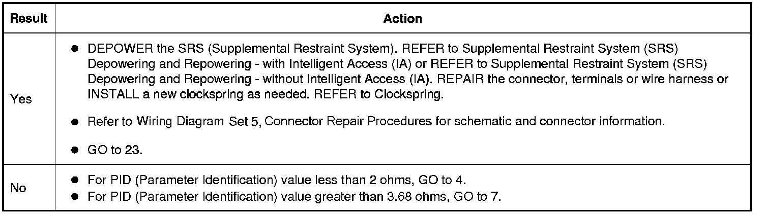 The RCM (Restraints Control Module) analyzes the deployment loop resistance to determine if a fault exists. The value displayed in the PID (Parameter Identification) is the deployment loop resistance measured by the RCM (Restraints Control Module). If the value displayed is lower or higher than the desired range (refer to diagram below), the RCM (Restraints Control Module) can set a DTC (Diagnostic Trouble Code). As the deployment loop resistance drifts farther outside the desired range, the chance for a DTC (Diagnostic Trouble Code) increases. Small variations in resistance can occur due to the effect of road vibrations on terminal fit. Crimps and terminals can be affected by stress and harness movement and can cause an increase in resistance due to wire strain. These variables can result in an intermittent fault. For this reason, the test requires the PID (Parameter Identification) value to be within the desired range before the fault is considered repaired, regardless if the module is reporting an on-demand DTC (Diagnostic Trouble Code) at the time of diagnosis. Following this direction helps make sure that minor changes in resistance do not create a repeat concern. This test uses process of elimination to diagnose each part of the deployment loop circuit including: