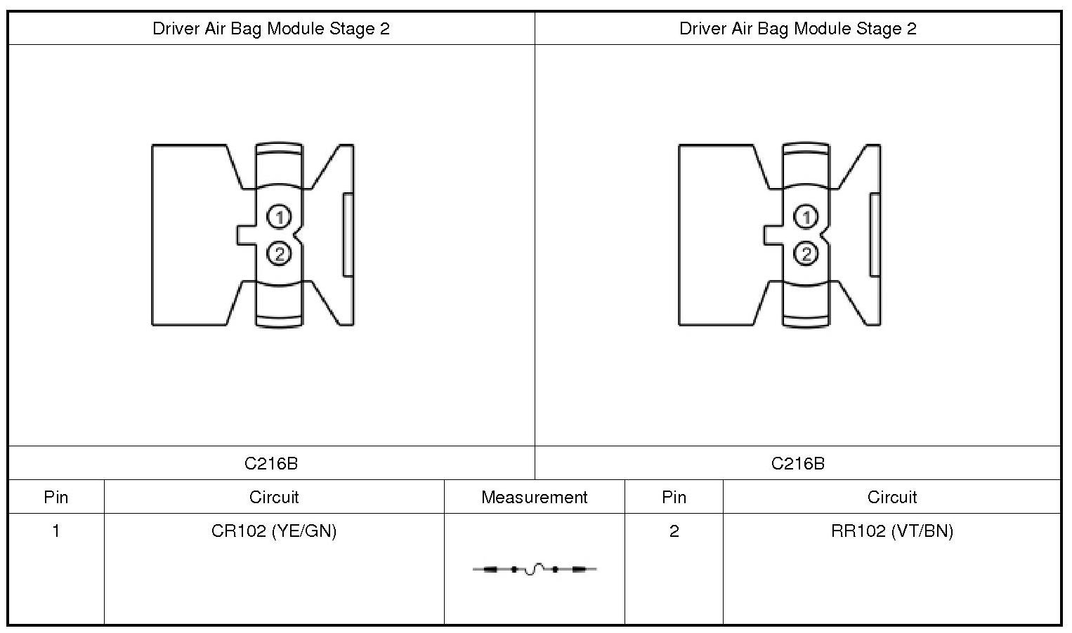 6. DIAGNOSTIC TIP: When viewing DTCs (Diagnostic Trouble Codes) with the driver air bag stage 2 circuits shorted together, a low resistance fault is normally retrieved on stage 2. Stage 1 shows an open circuit fault because the driver air bag is disconnected.