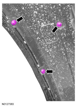 6. Install the 3 fender moulding pin-type retainers at the rear of the moulding.