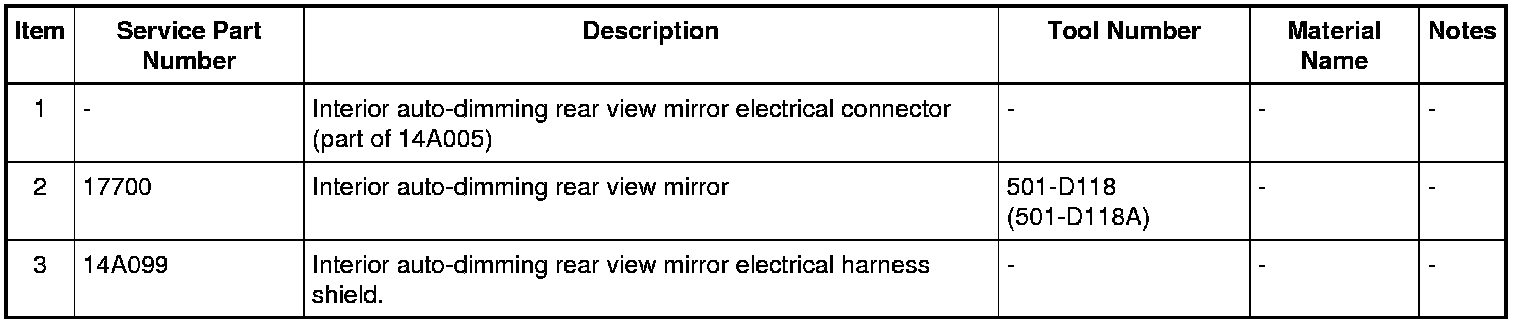 Release the interior rear view mirror mount from the windshield bracket by pulling 501-D118 (501-D118A) downward and away from the windshield.