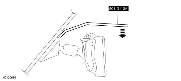 5. NOTICE: Make sure 501-D118 (501-D118A) is fully inserted into the interior rear view mirror mount access hole. Otherwise, damage to the windshield glass may occur.