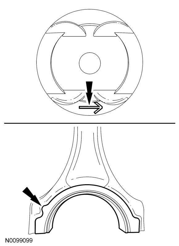 3. NOTE: If the piston and/or connecting rod are being installed new, the piston rod orientation marks and the arrow on the top of the dome of the piston should be facing toward the front of the engine block.