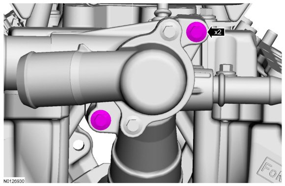 62. Remove the 2 thermostat housing-to-lower intake manifold bolts.