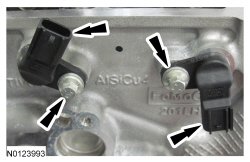 97. NOTE: The 2 VCT (Variable Camshaft Timing) oil control solenoids are removed for clarity.