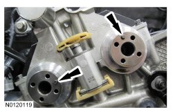 Position the 2 LH (Left Hand) VCT (Variable Camshaft Timing) assemblies and secondary timing chain onto the camshafts by aligning the holes in the VCT (Variable Camshaft Timing) assemblies with the dowel pins in the camshafts.