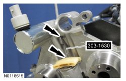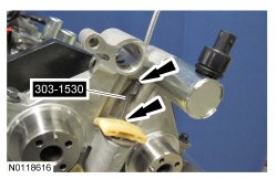 60. Compress the RH (Right Hand) secondary timing chain tensioner and install 303-1530 to retain the tensioner in the collapsed position.