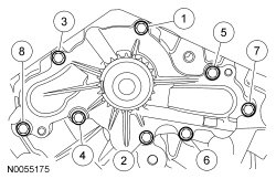 39. Install the coolant pump and the 8 bolts. Tighten in the sequence shown in 2 stages: