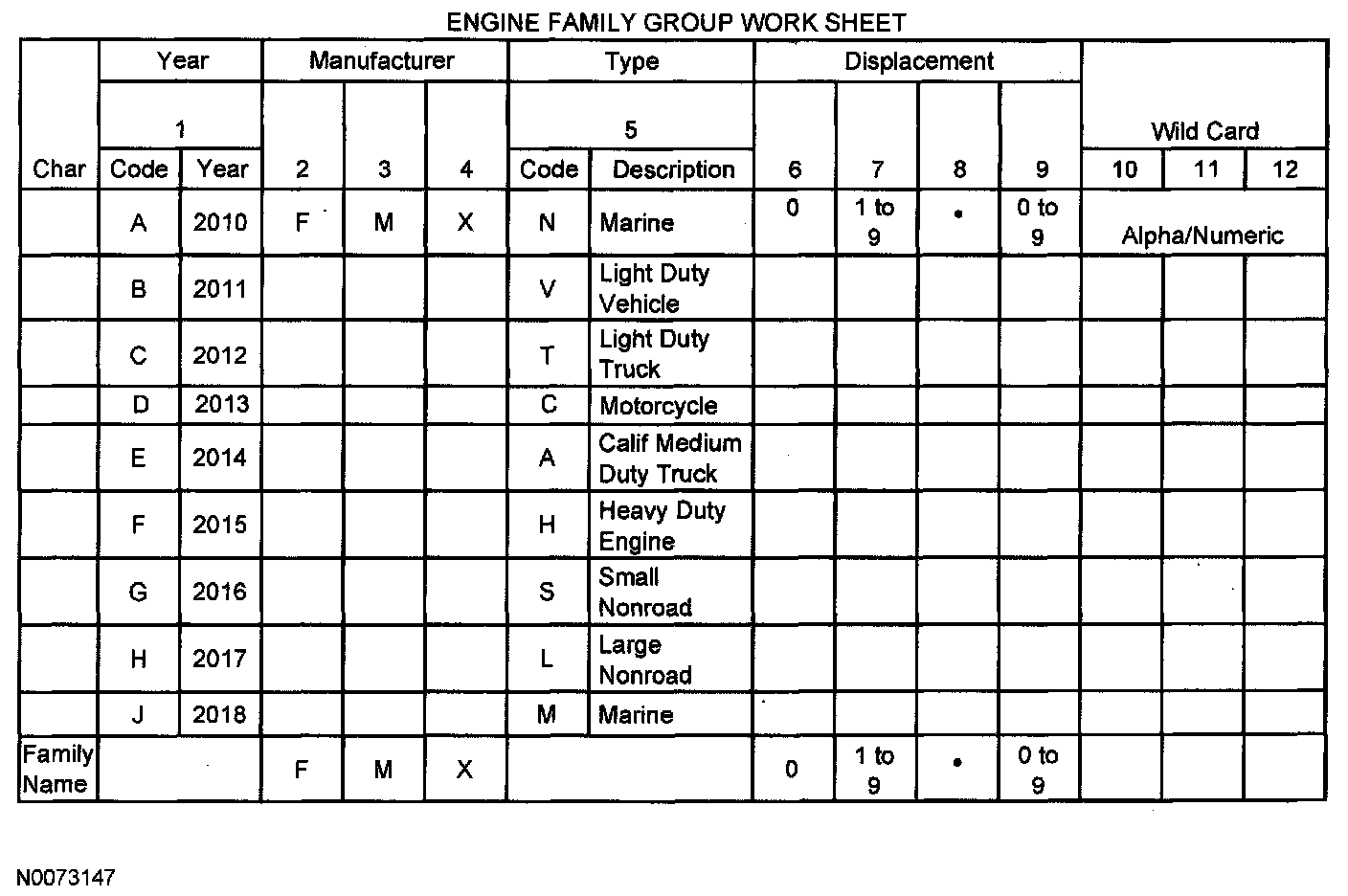 Both the engine family group and the evaporative family name are listed in the box on the emission decal in the area marked as engine evaporative family information. The first line contains engine size and the 12-character engine family group. The second line contains the 12-character evaporative family name information. Both the engine family group and the evaporative family name are specific to the vehicle. Refer to the Engine Family Group and the Evaporative Family Name worksheet for decoding information.