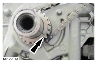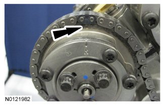 - Align the colored link on the timing chain with the timing mark on the LH VCT assembly.