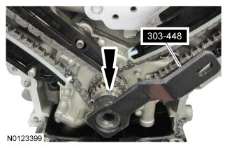 19. Depress the LH secondary timing chain tensioner and turn the tensioner 90 degrees.