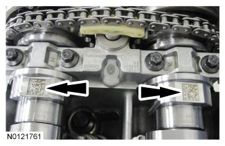 4. NOTE: It may be necessary to rotate the exhaust camshaft slightly (using a wrench on the flats of the camshaft) to seat the VCT assemblies onto the camshafts.