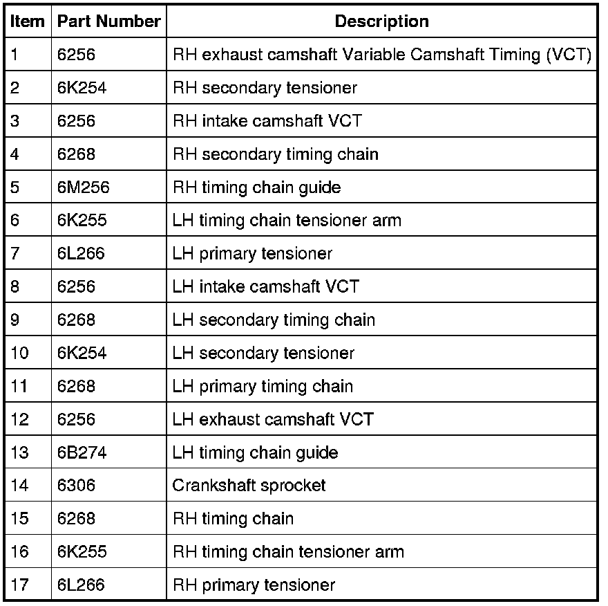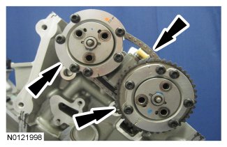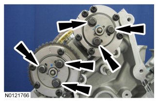 Install the 3 RH intake VCT assembly bolts and the 3 RH exhaust VCT assembly bolts.
