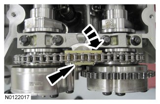 1. The timing mark on the intake VCT assembly should align between the 2 consecutive colored links.