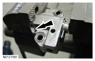 Compress the primary timing chain tensioner plunger, using an edge of a vise.