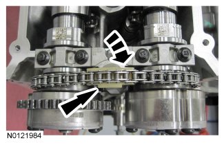 - Align the colored link on the timing chain with the timing mark on the RH VCT assembly.