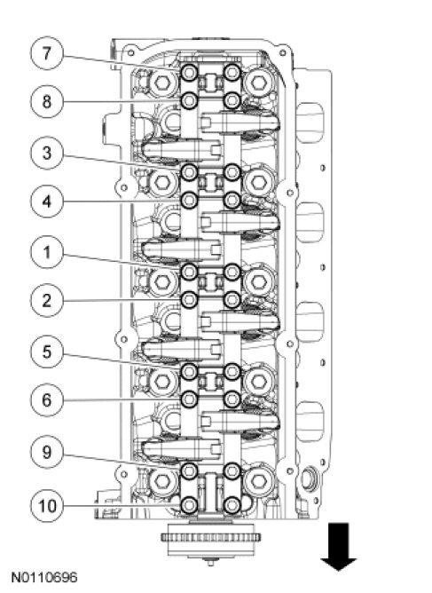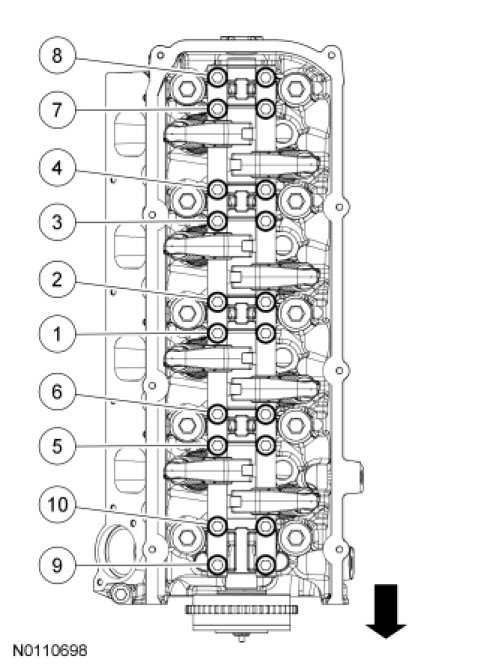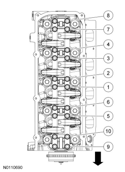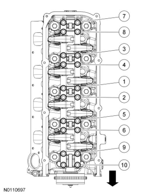 26. Tighten the 10 RH intake rocker arm shaft assembly bolts in the sequence shown, in 3 stages.