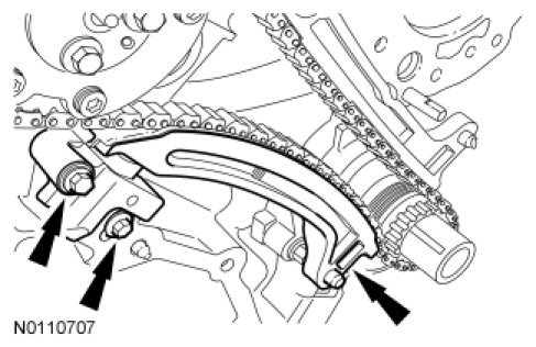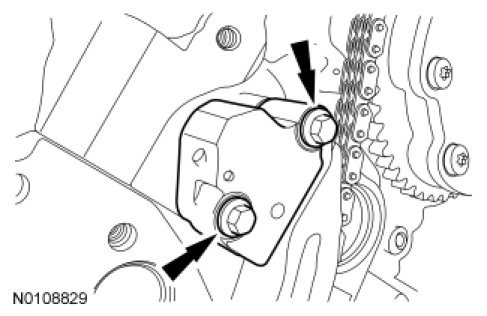 8. Position the LH timing chain tensioner and install the 2 bolts in 2 stages.