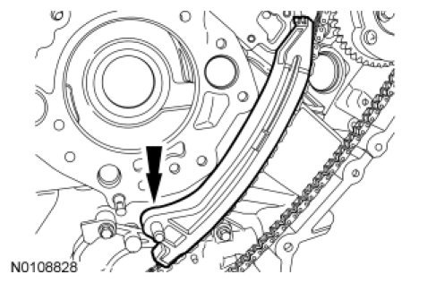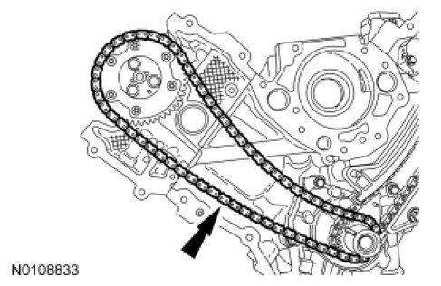 5. NOTE: Make sure the upper half of the timing chain is below the tensioner arm dowel and above the chain guide pin.